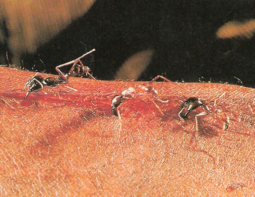 رؤوس النمل علاج حقيقي مستخدم في أجزاء من آسيا وأفريقيا وأمريكا الجنوبية. فيُعرف نمل الجيش بالفك السفلي الكبير، وكان الناس في الصين القديمة يستخدمونه في خياطة الجروح. ويتم وضع النملة على جانبي الجرح المفتوح، ستضيق النملة الخناق على اللحم، وحين يشعر المصاب بلسعة في مكان الجرح، هذا يعني أن النملة قامت بإغلاق الجرح. ويمكن سحب رؤوس النمل من أجسادها، وستبقى ملتصقة بمكان الجرح.